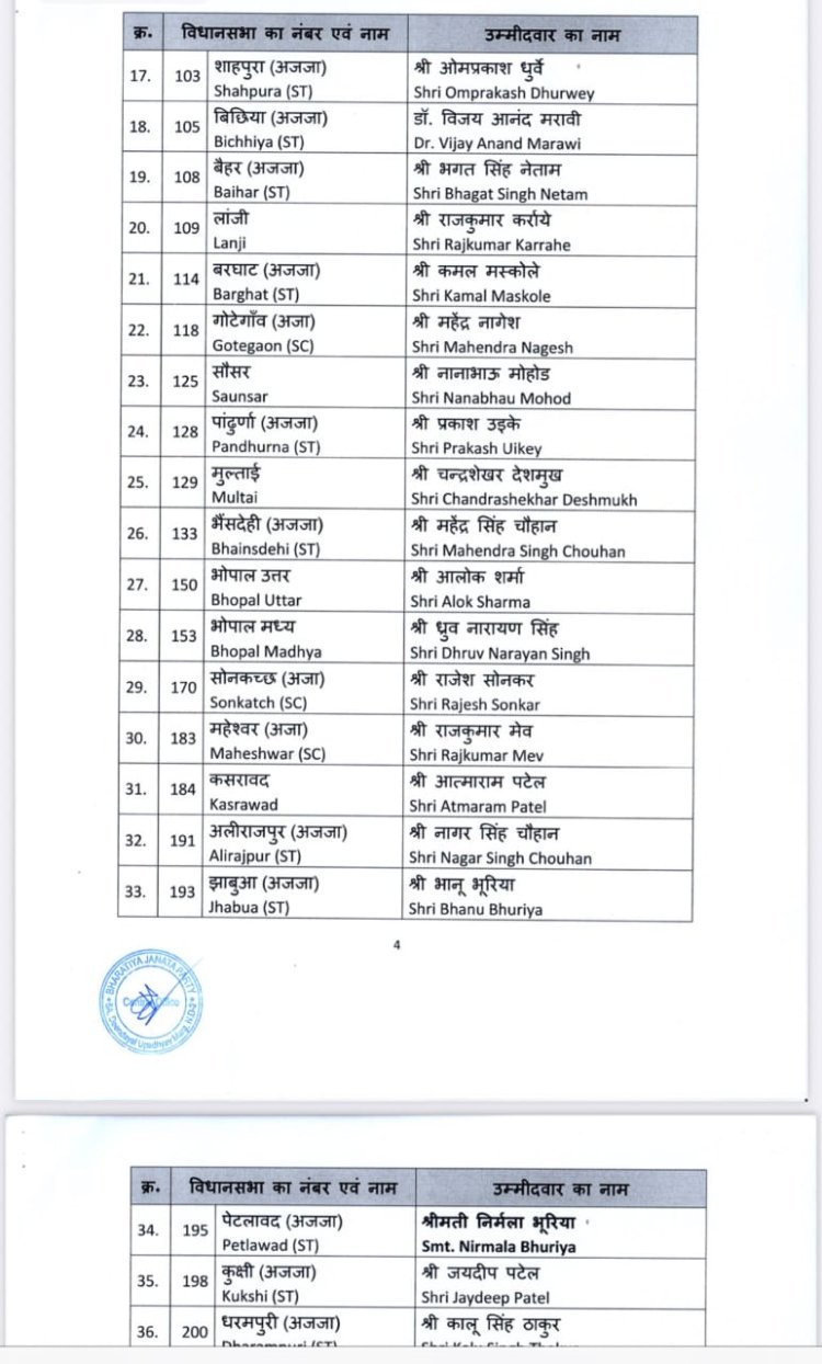 मध्यप्रदेश आगामी विधानसभा चुनाव के लिए भारतीय जनता पार्टी केन्द्रीय चुनाव समिति द्वारा घोषित उम्मीदवारों को हार्दिक बधाई।
