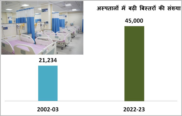 अस्पताल में बिस्तरों की संख्या 21 हजार 234 से बढ़कर 45 हजार से अधिक हुई। आईसीयू बेड की संख्या 277 से बढ़कर 2085 हुई।